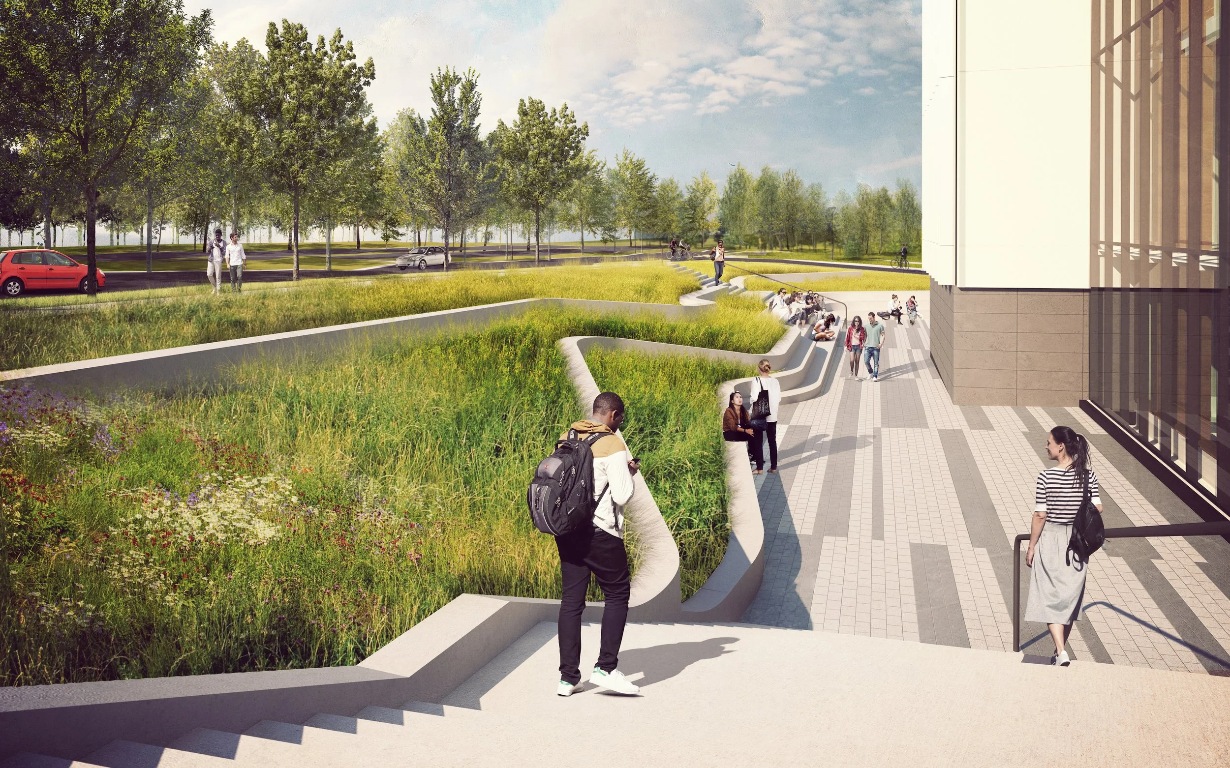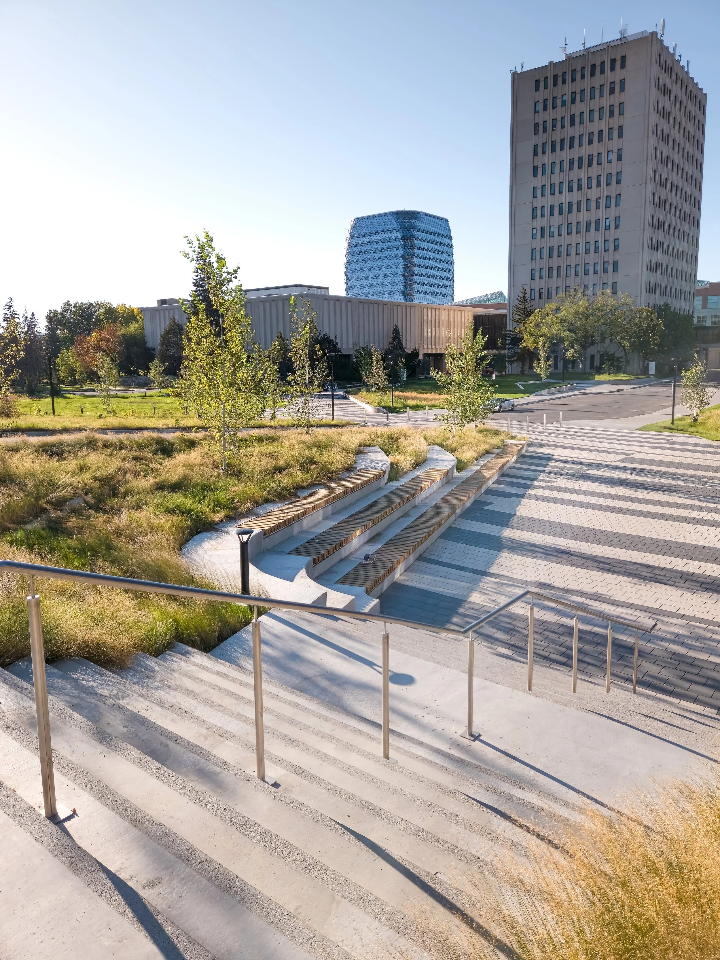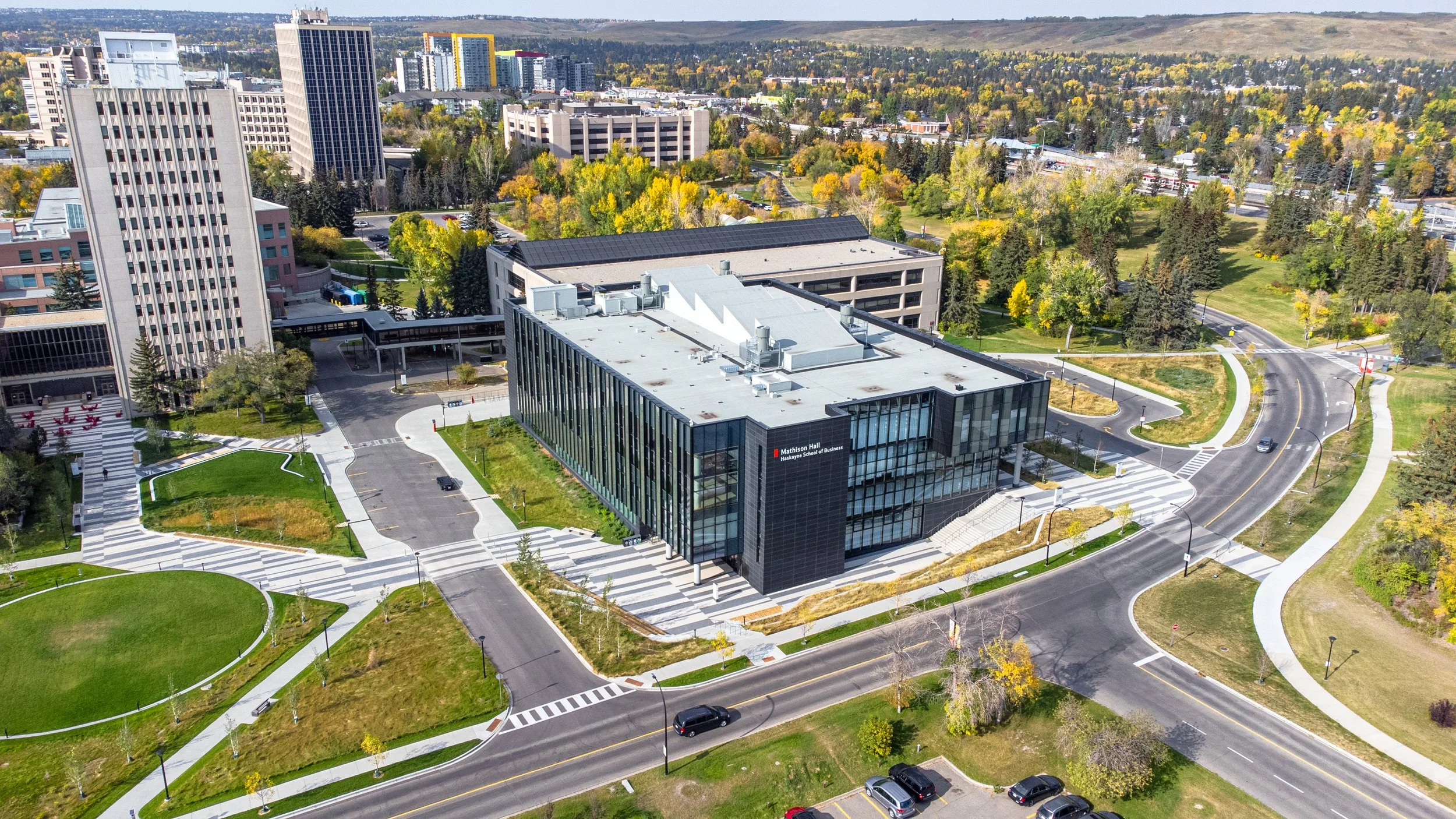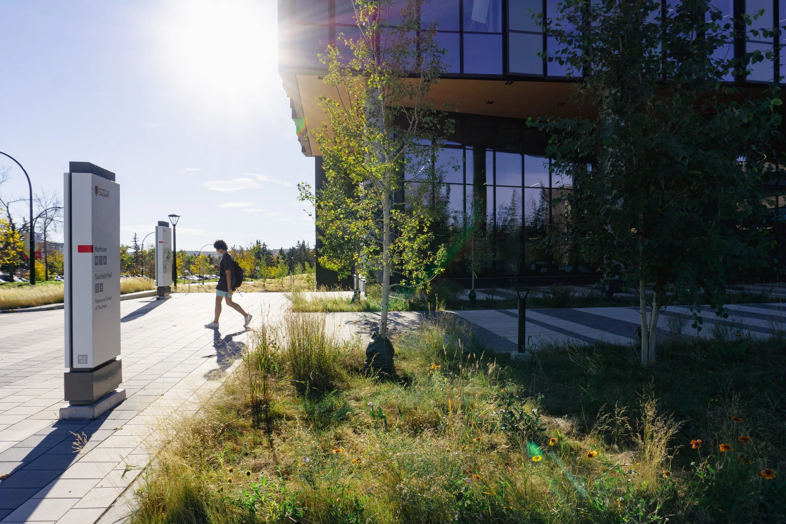 The University of Calgary commissioned a new academic building for the Haskayne School of Business, entitled Mathison Hall, to expand on their existing facilities and create a dynamic, technology rich, highly sustainable and innovative new facility to meet the expanding program needs. O2 was retained to re-design approximately 2.5 ha of the campus landscape surrounding the Haskayne School of Business to support the functions of the students in the adjacent buildings. Key features of the design include new plazas with social spaces and welcoming building entry points, a flexible event lawn, a reconfigured service road and drop-off loop and green spaces that incorporate rain gardens to manage stormwater.